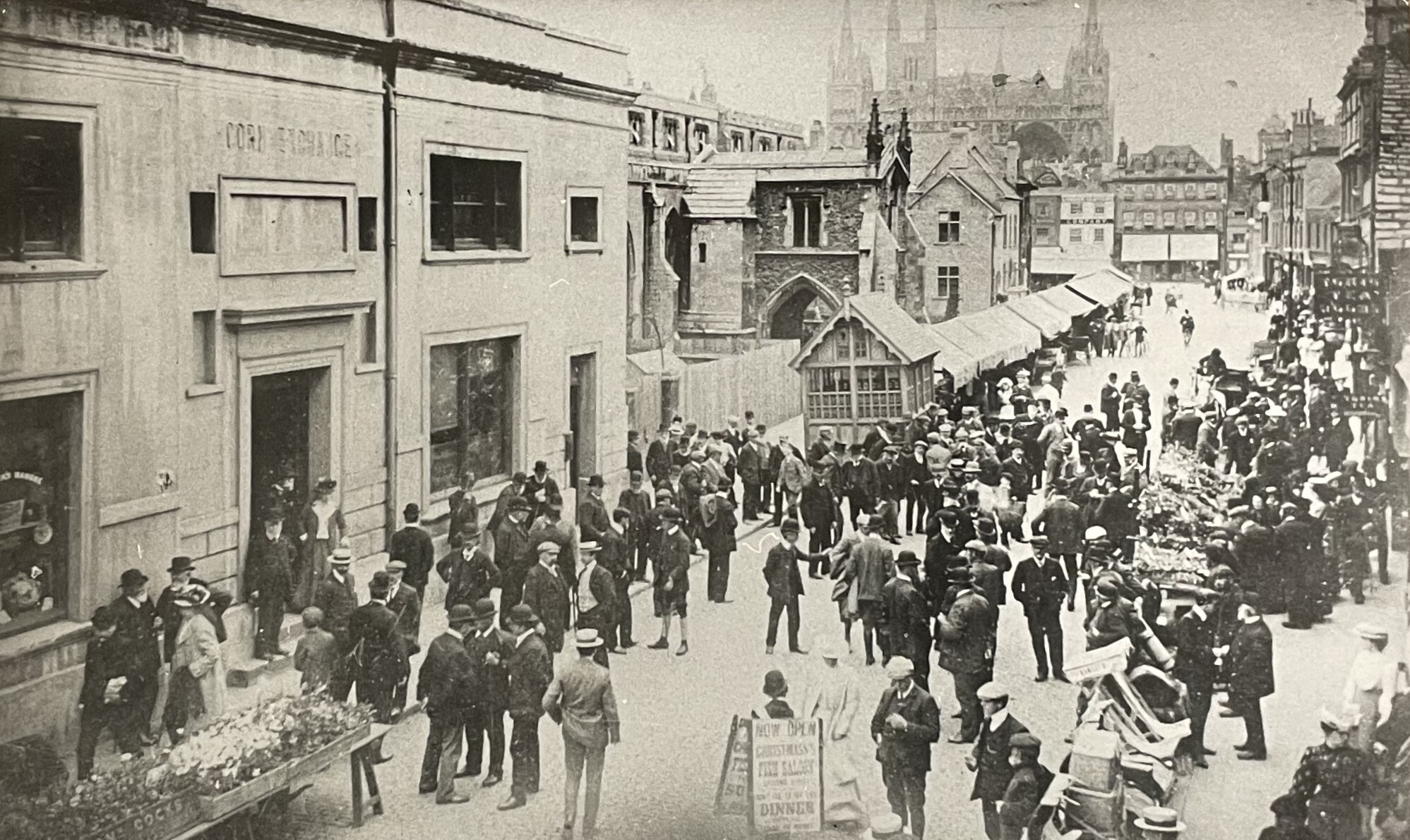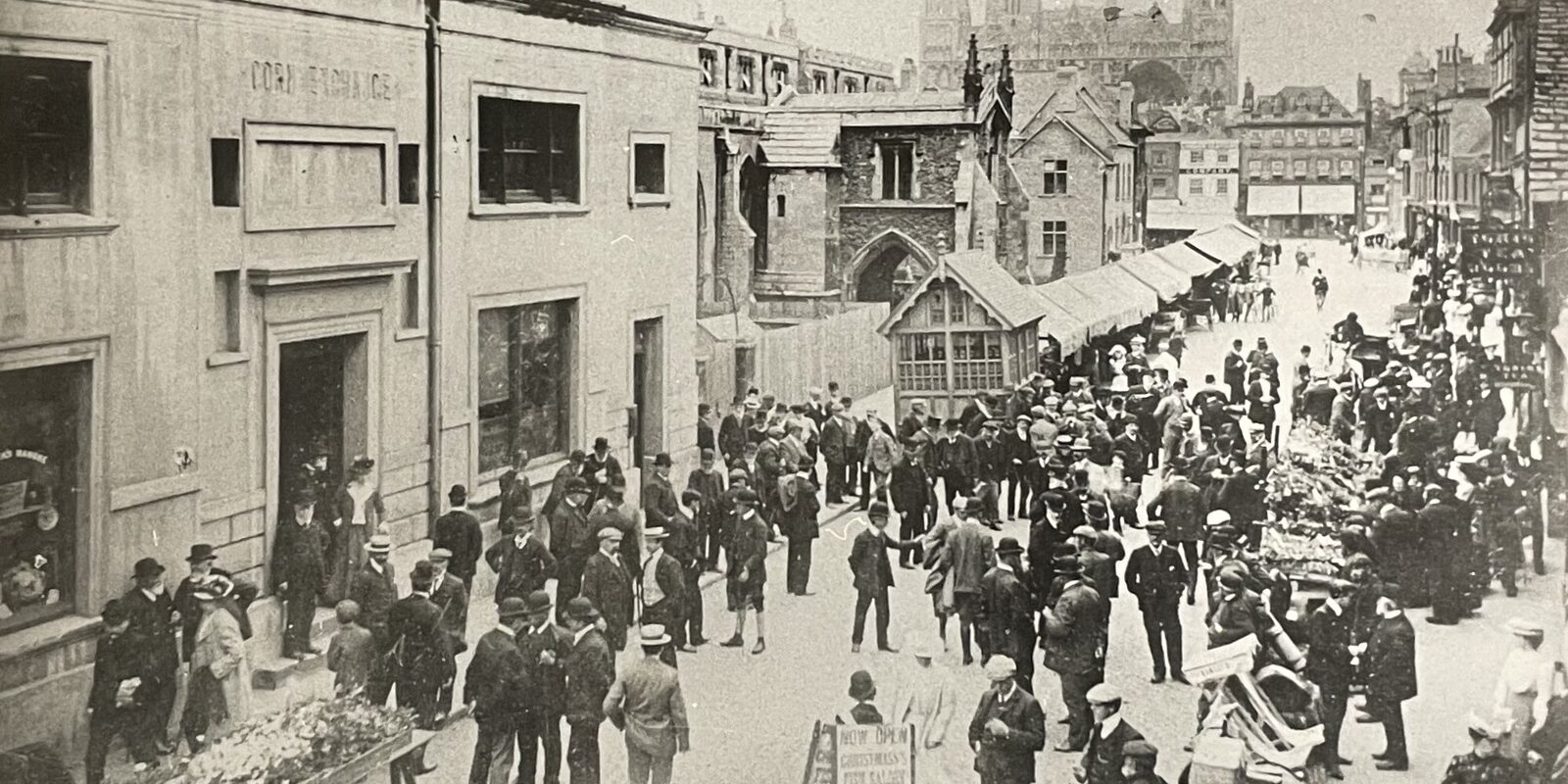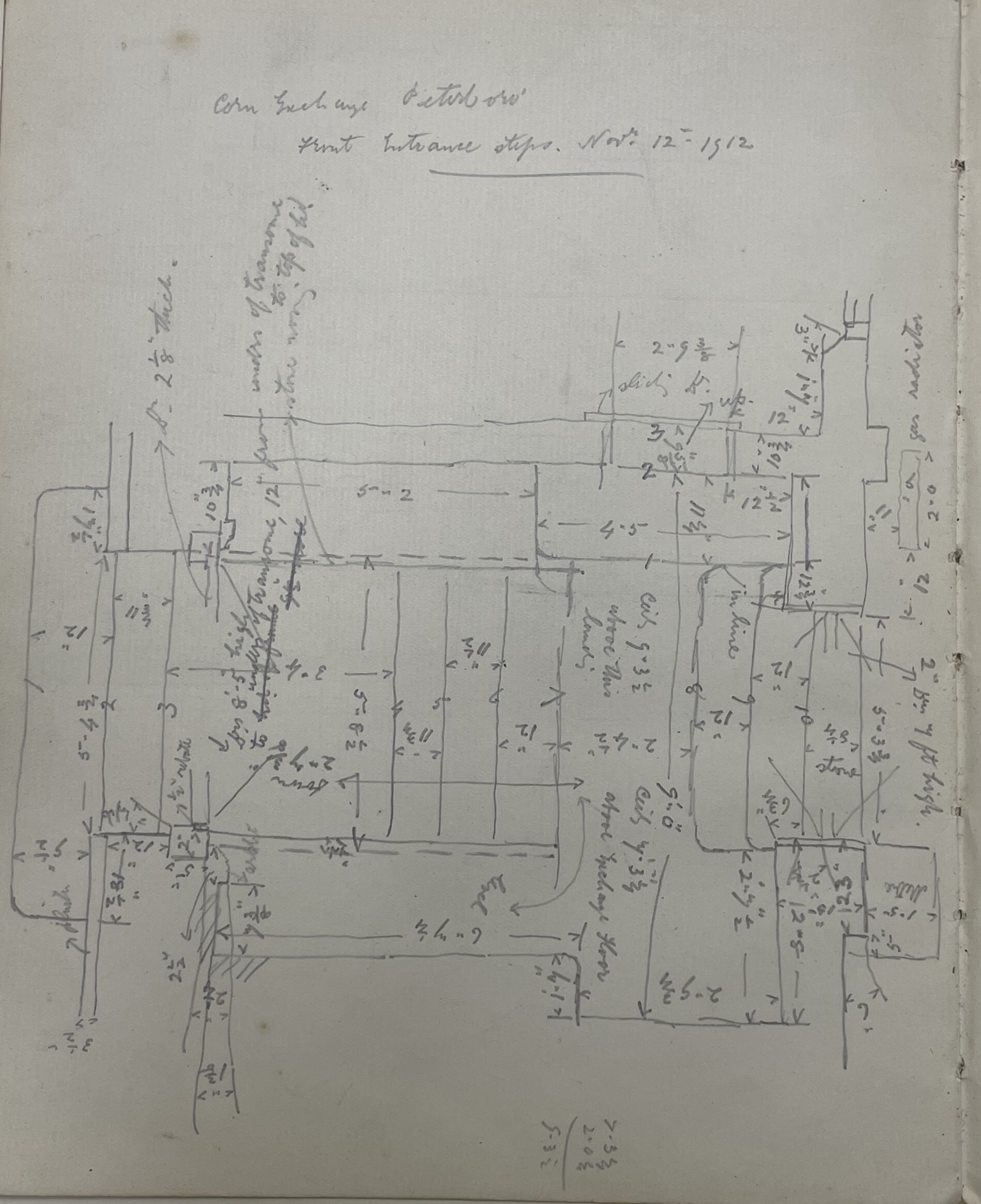 One example from the collection, featured here, shows a 1912 sketch of the Peterborough Corn Exchange, complete with a floor plan and dimensions recorded in inches. It truly is a wonderful glimpse into the working methods of early 20th century architects. Although the Corn Exchange is no longer standing, we are also able to share an historic photograph of the building as it once appeared. The image below shows the Corn Exchange on the left and comes from the Archives Service’s own local photograph collection, held under the reference 80/12/16.